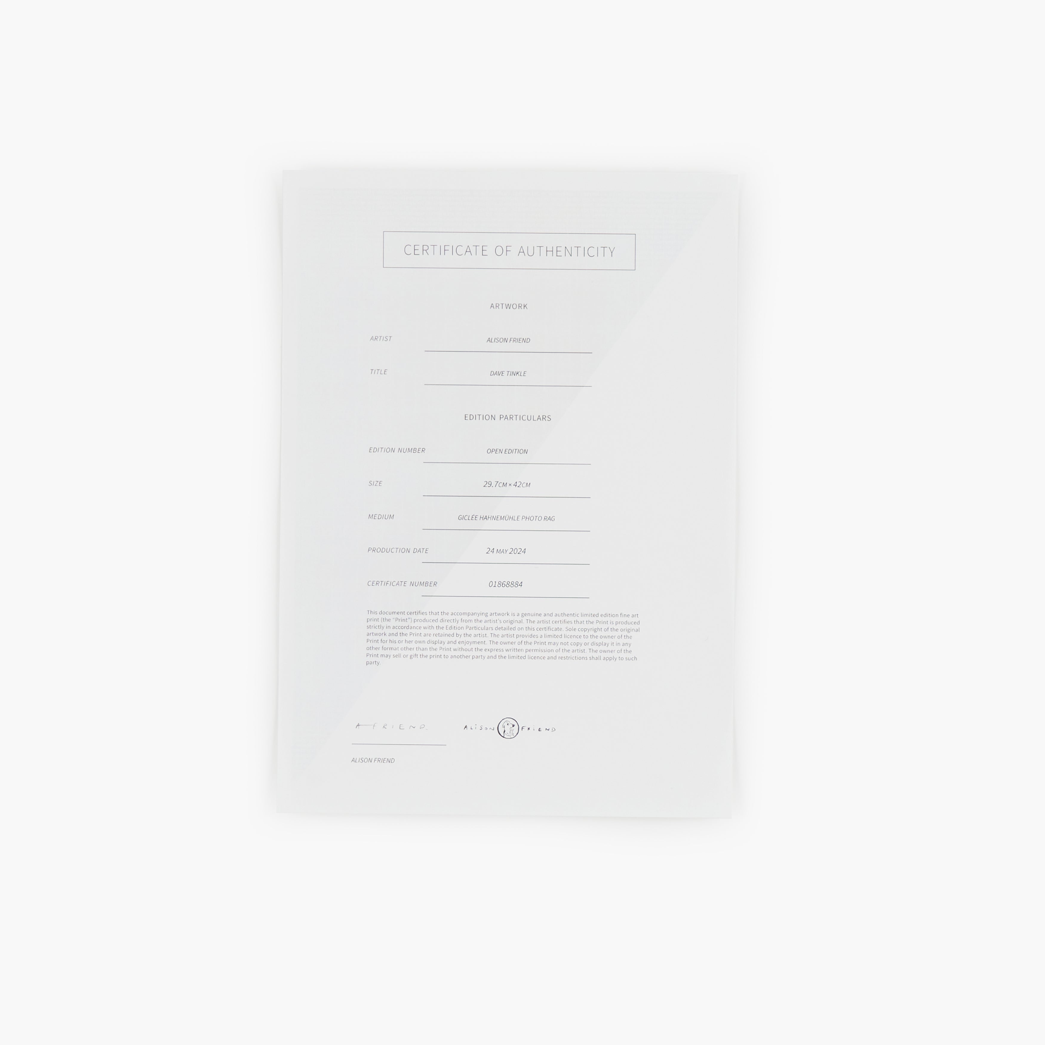 - Digitally signed Giclée prints on archival, acid-free Hahnemühle Photo Rag paper